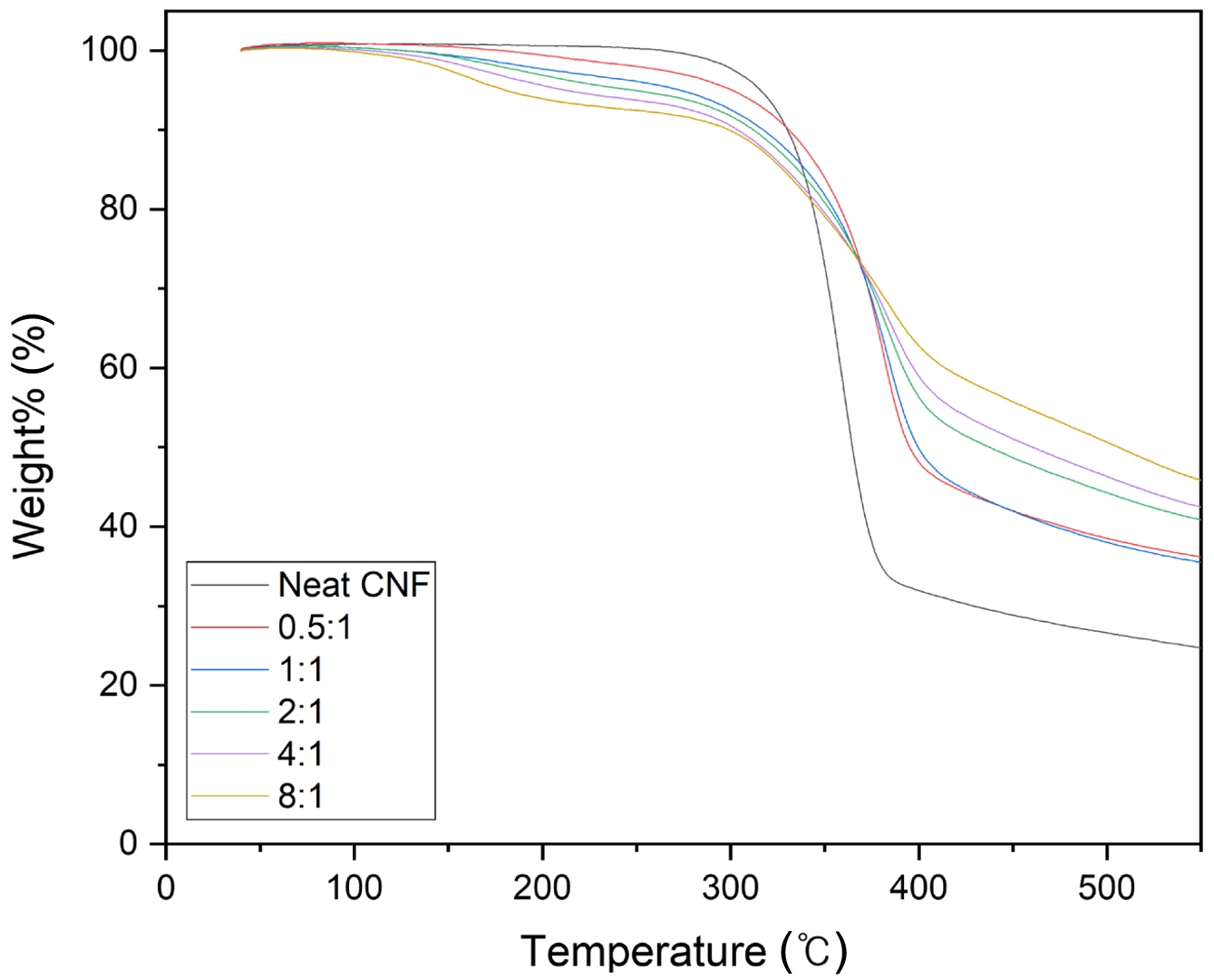 열적 특성 분석. Perkin Elmer(미국) 사의 thermogravimetric analysis(TGA), TGA4000을 사용하여 APTES-CNF의 열적 안정성을 분석하였다. 질소 분위기 하에서 40 ℃부터 550 ℃까지 10 ℃/min의 승온 속도로 분석하였다.