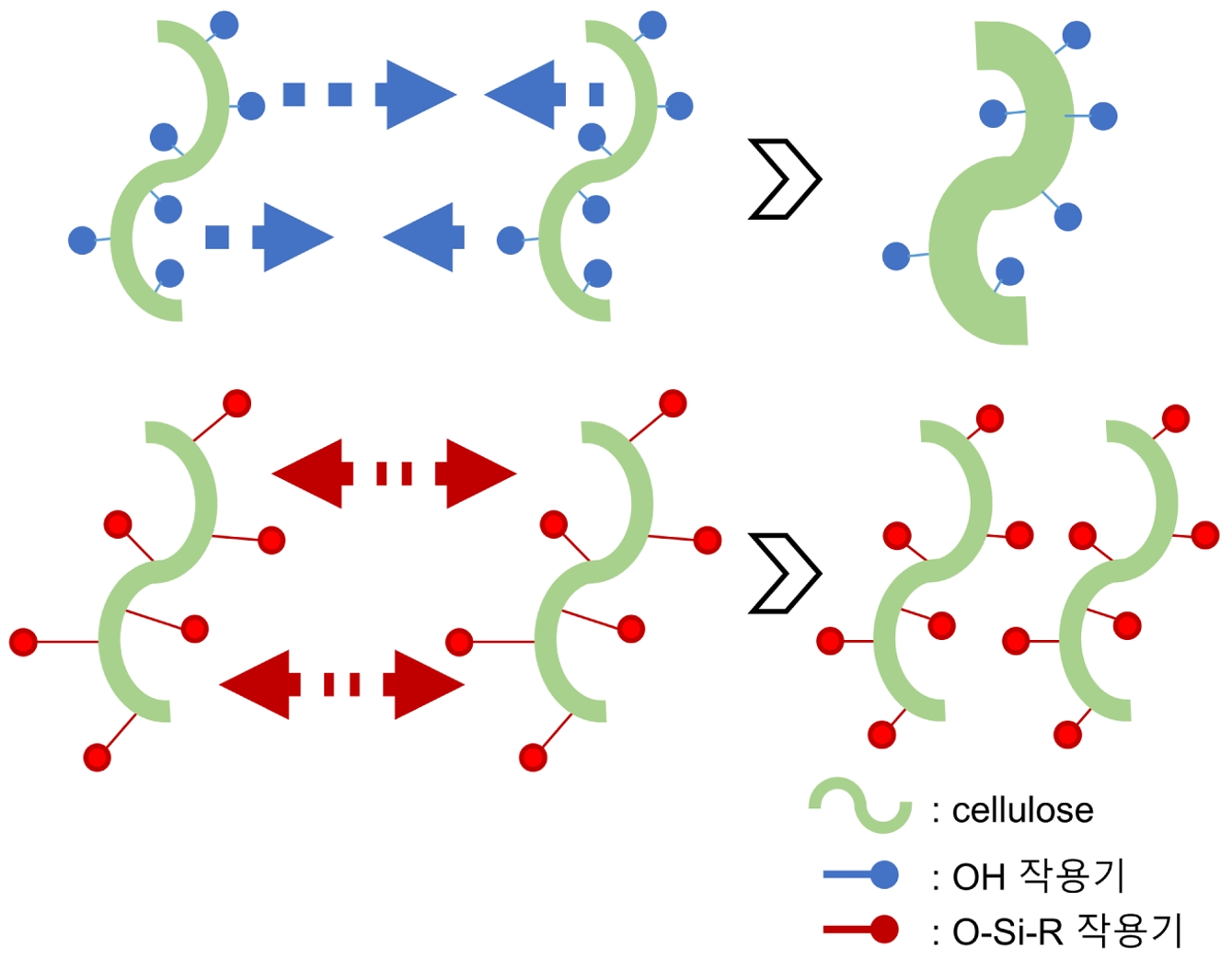 하지만 CNF는 여러 장점들을 가지고 있음에도 현재까지 상용화가 진행되지 못하였다. 이는 CNF의 2가지 문제점 때문이다. 첫째, CNF는 높은 친수성을 지닌 물질로 소수성인 고분자와의 상용성 및 계면 접착력이 약하다는 것이다.12-14 이로 인해 고분자 수지에 CNF 첨가 시 CNF의 자가 응집이 발생하고, 이는 고분자 수지의 물성을 오히려 약화시킨다.
