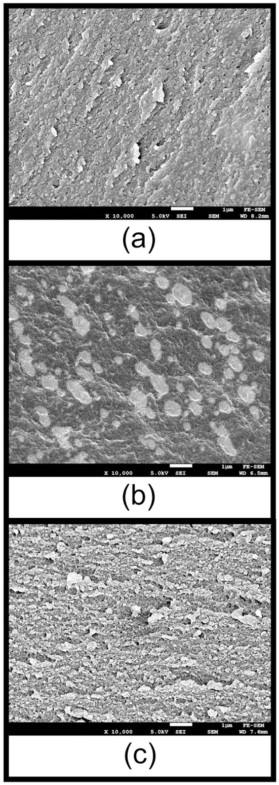 Figure 6 Compatibility of CNF and PU according to silane: (a) neat PU film; (b) neat CNF/PU film; (c) APTES-CNF/PU film. |