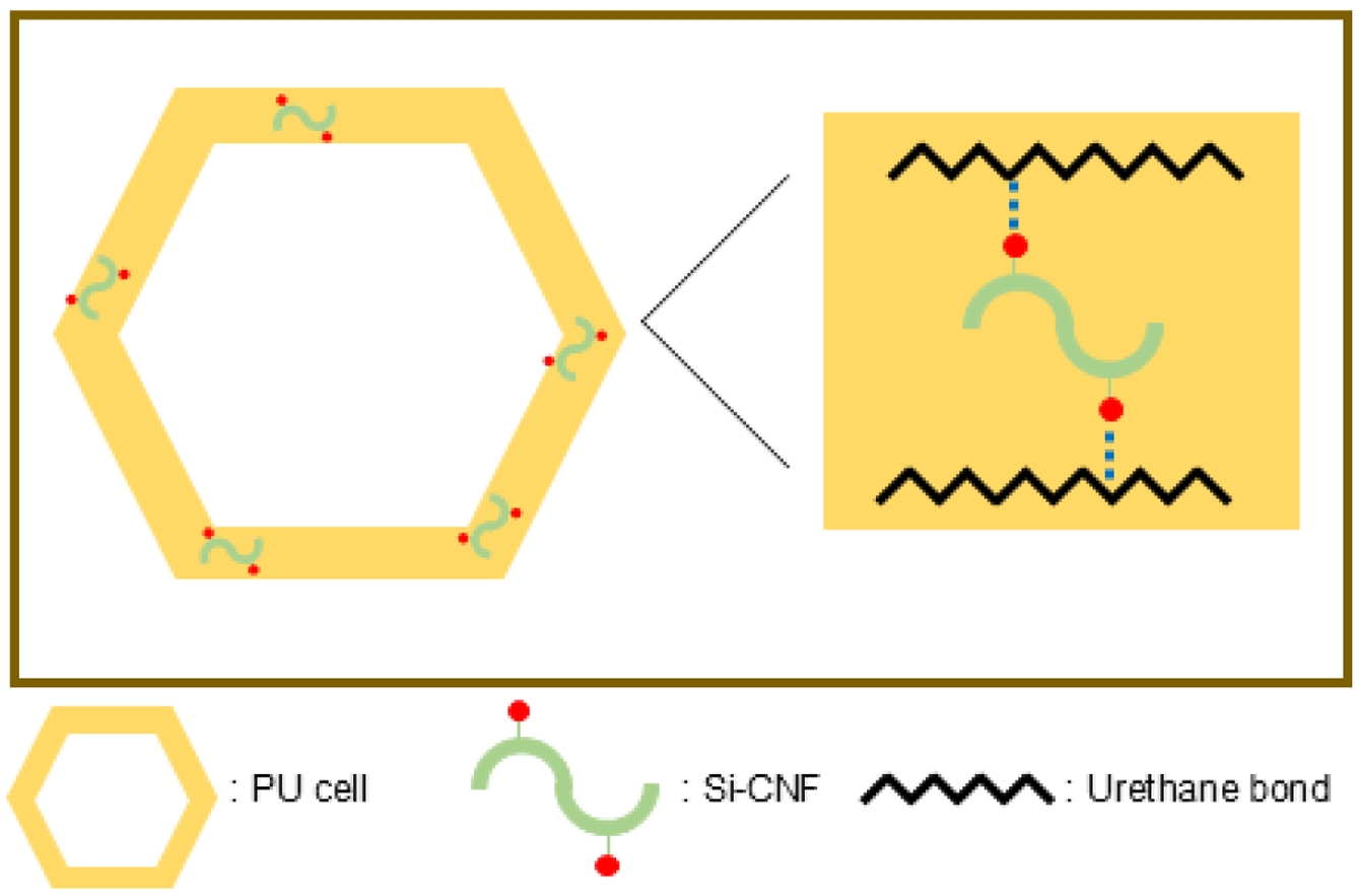 특히 폴리우레탄 폼에 CNF를 복합화할 시 CNF의 수산기와 이소시아네이트의 NCO기가 만나 우레탄 결합을 형성하여 PUF의 기계적 물성을 강화시킬 수 있다. 또한 CNF는 높은 비표면적을 지니며 작은 입자 크기로 PUF 내에서 핵제(nucleating agent)로 사용되어 폼의 미세 구조를 조정할 수 있다. Haridevan은 RPUF의 물성 향상을 위해 폴리올 내 CNF를 분산시킨 후 RPUF를 합성하였다. 그 결과, 폴리올에 잘 분산된 CNF가 PU 내에서 cell의 유착을 억제하여 더 작은 cell의 형성을 이루었으며 CNF 첨가로 인해 PU 발포 과정에서 수지의 점도가 상승하였고, 이는 cell의 성장을 억제하여 cell의 크기가 감소하였다.10 또한 CNF와 PU 매트릭스 간의 수소 결합을 통해 주어진 하중을 CNF로 전달하면서 수직 방향의 압축 강도가 증가하였다.10