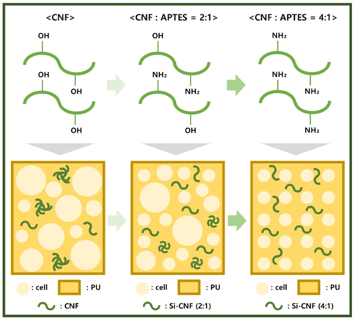 경질 폴리우레탄 폼의 물성을 향상시키기 위해 서로 다른 농도의 APTES로 표면 개질된 CNF를 합성한 후 이를 PU에 첨가하여 PU 복합 발포체를 합성하였다.