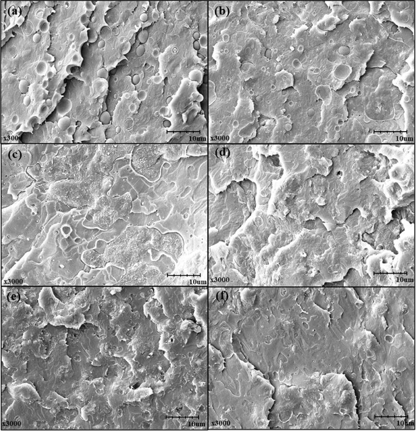 Figure 2 SEM images of biodegradable PLA/PBAT blend with CNT: (a) PLA/PBAT; (b) CNT1; (c) CNT2; (d) CNT3; (e) CNT4; (f) CNT5. |