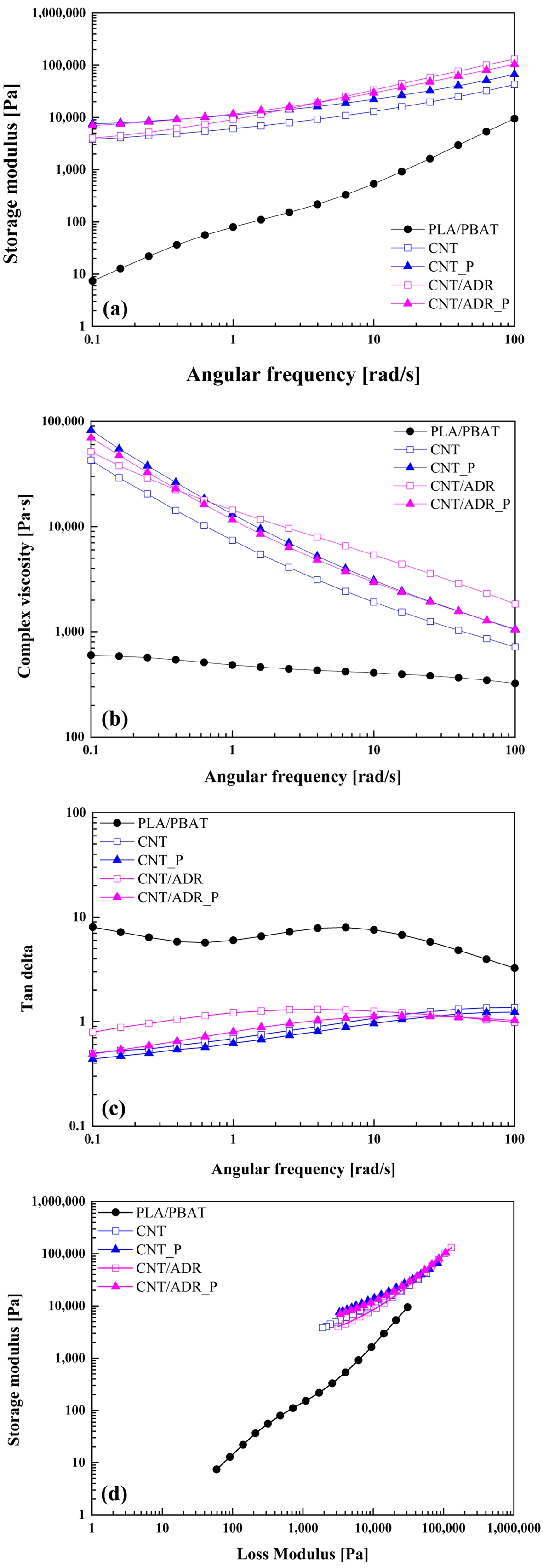 유변학 분석에서 Tan delta 그래프와 Cole-cole 그래프는 고분자 블랜드의 미세구조를 예측할 수 있는 지표로 활용된다.11 Figure 6(c)에서 저주파수 영역의 저장탄성률은 일괄투입 블랜드에 비해 고분자 매트릭스를 사전 용융혼합 한 경우 더욱 탄성체와 같은 거동을 보인다. 특히, CNT_P가 가장 탄성체와 같은 거동을 보인다. Figure 6(d)에서도 PLA/PBAT를 제외한 나머지 블랜드에서 같은 함량의 CNT가 첨가되었음에도 불구하고 그래프는 모두 다른 영역에서 나타난다. 이를 통해 고분자 미세구조에 변화가 발생했을 것이라 판단된다.12 따라서, CNT와 ADR의 첨가, 그리고 고분자 매트릭스 사전용융 혼합 여부에 의해 블랜드의 미세 구조가 변하였음을 확인하였다. 또한, CNT_P 가장 안정적인 3D-network 구조를 형성하였음을 알 수 있다.