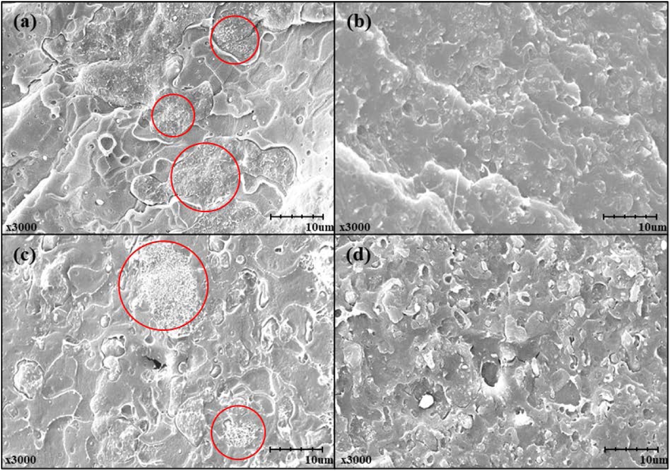 Figure 7 SEM images of PLA/PBAT-based conductive composites through improved compatibility: (a) CNT; (b) CNT_P; (c) CNT/ ADR; (d) CNT/ADR_P. |
