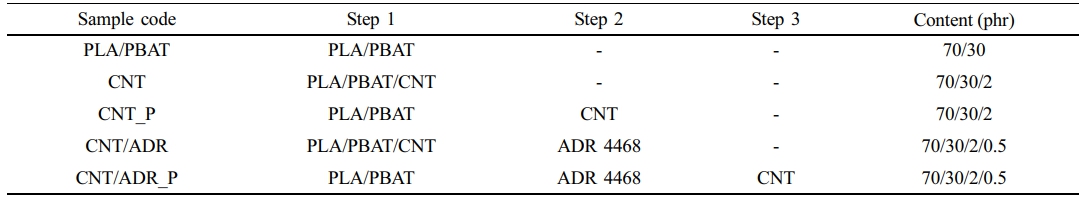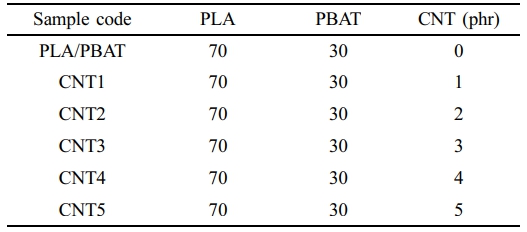 재료. PLA(IngeoTM Biopolymer 3251D)는 NatureWorks Co. Ltd.(USA)의 제품을 구매하였다. PLA의 물성은 다음과 같다. Specific gravity는 1.24, 유리전이온도는 55-60 ℃, 용융 온도는 155-170 ℃, melt flow index(190 ℃, 2.16 kg)는 35 g/10 min 이다. PBAT(A400)는 ZhuHai WanGo Chemical Co., Ltd.(China)의 제품을 구매하여 사용하였으며, PBAT의 물성은 Specific Gravity는 1.22, 용융 온도는 115-125 ℃, melt flow index(190 ℃, 2.16 kg)는 4.0 g/10 min이다. MWCNT(K-Nanos 210)는 금호석유화학(주)(Korea) 제품을 구매하였다. MWCNT는 다발 길이 40-50 um, 직경 11-13 nm, 순도는 95% 이상의 pellet type을 사용하였다. 상용화제는 BASF SE(Germany)사의 Joncryl® ADR 4468을 사용하였다. ADR 4468의 specific gravity, 25 ℃는 1.08, 분자량은 7250, 유리전이온도는 95 ℃, 에폭시 당량은 310 g/mol이다.