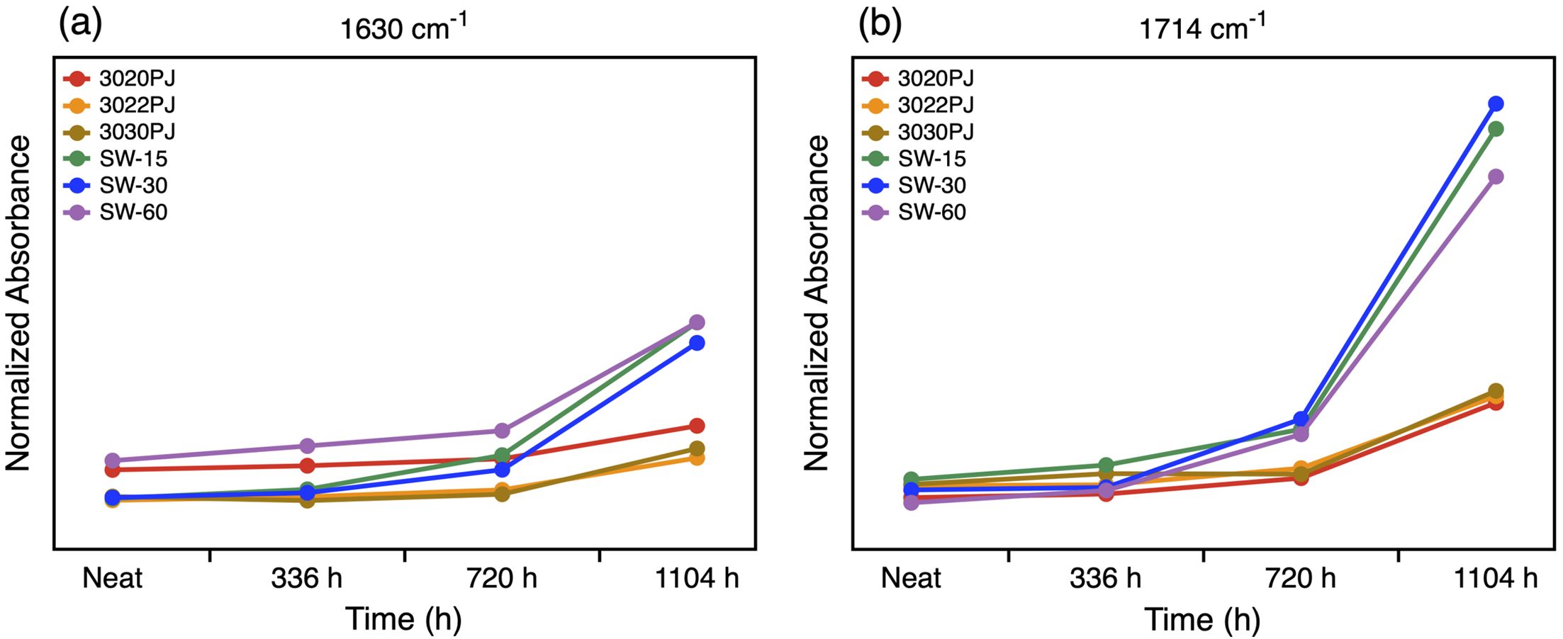 Figure 1 Normalized peak intensities at 1630 cm and 1714 cm for virgin and recycled PC samples over the aging period. The intensities were normalized using the 1013 cm-1 peak: (a) 1630 cm-1; (b) 1714 cm-1. |