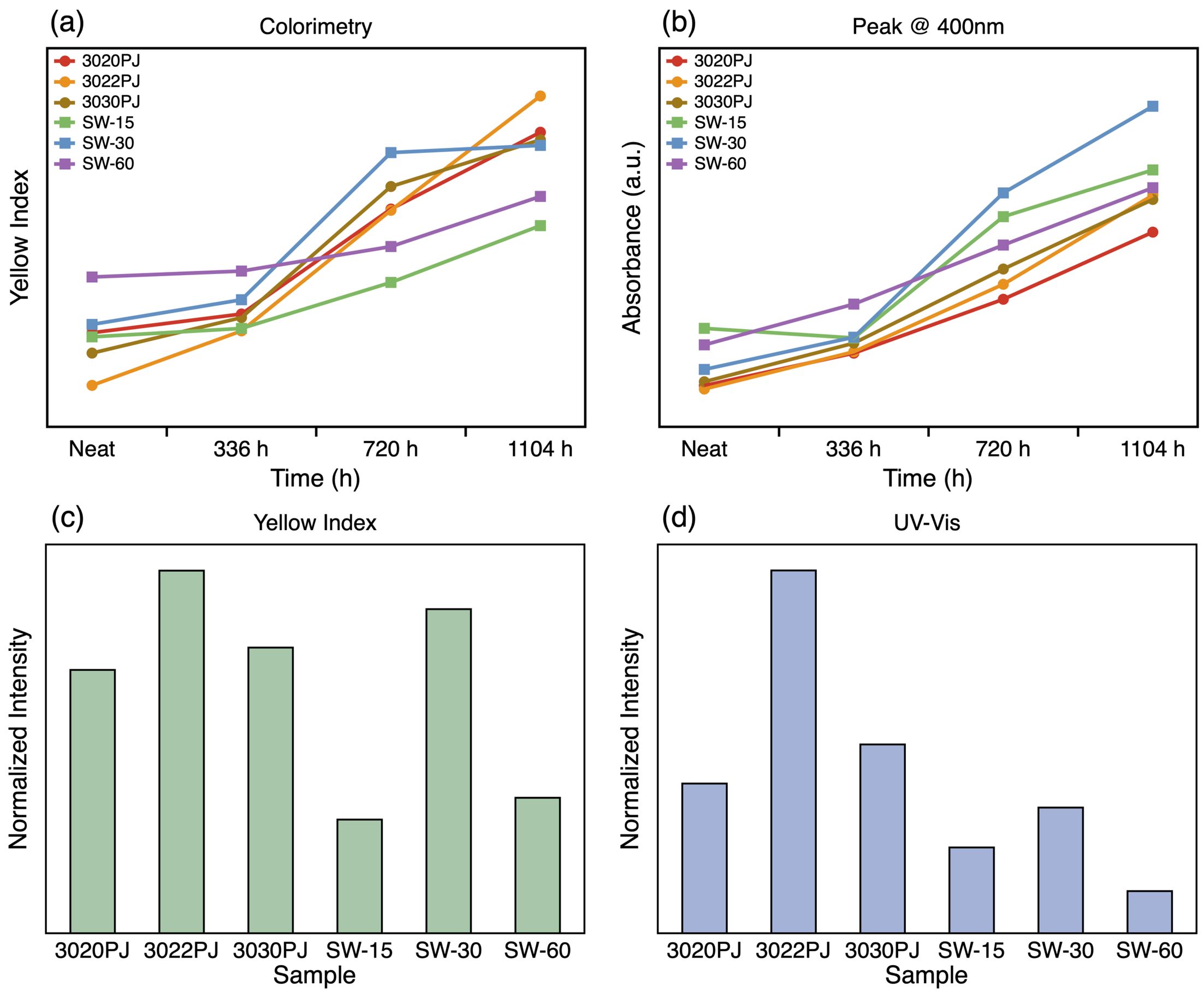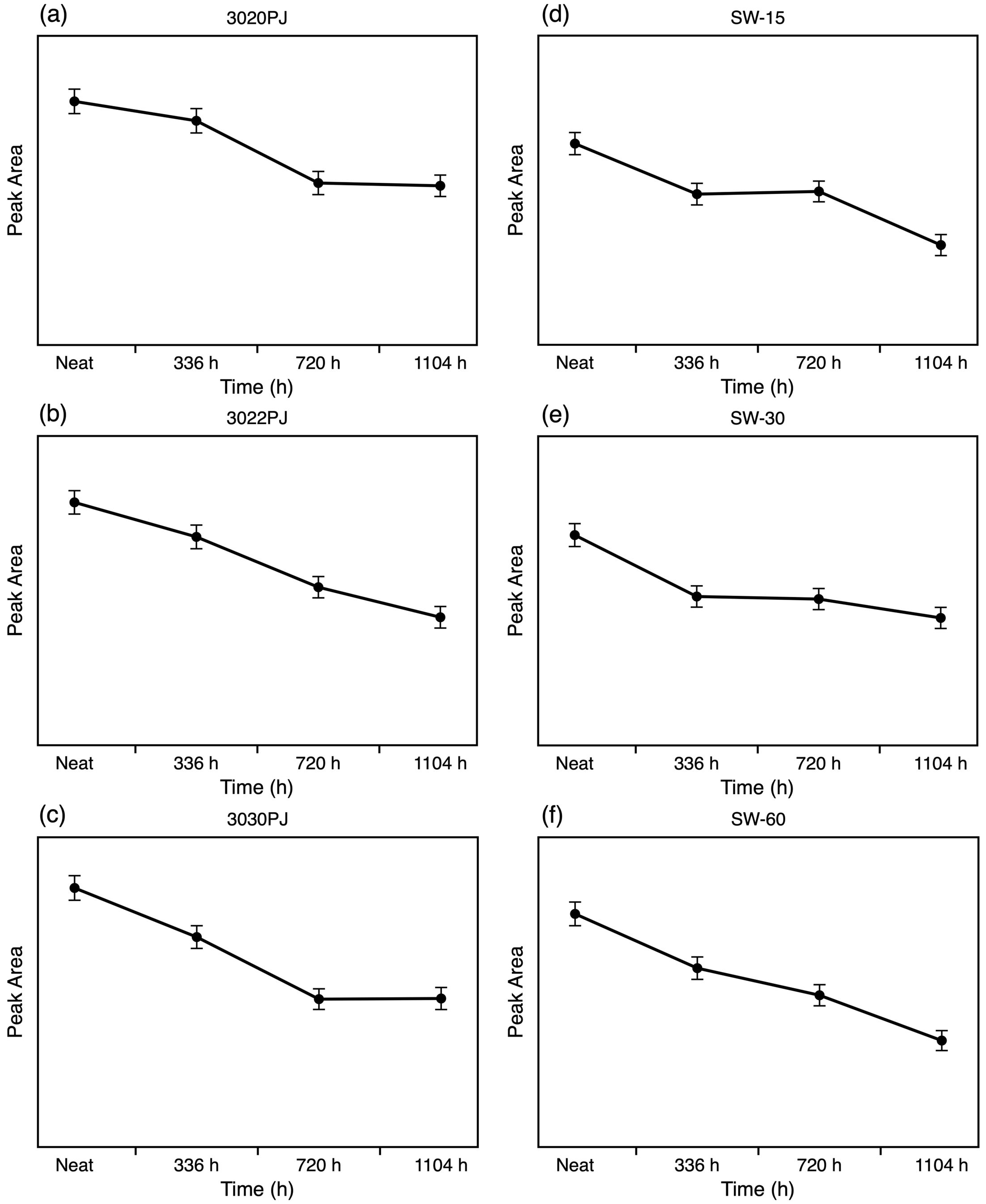 Figure 2 UV-Vis absorbance spectra of PC samples over time: (a) 3020PJ; (b) 3022PJ; (c) 3030PJ; (d) SW-15; (e) SW-30; (f) SW-60 |