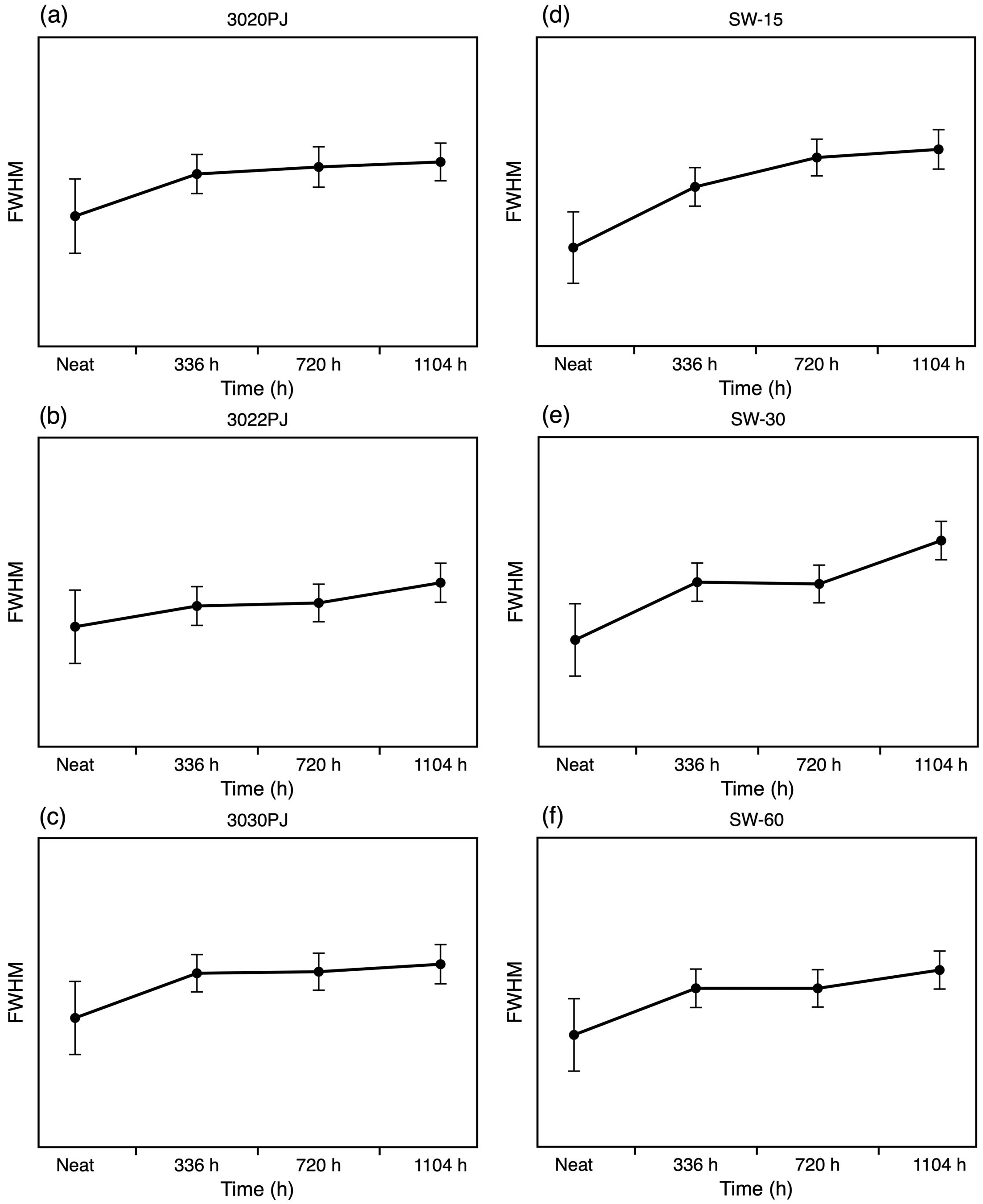 Figure 5 Full width at half maximum (FWHM) of the first diffraction peak in PC samples obtained from XRD analysis: (a) 3020PJ; (b) 3022PJ; (c) 3030PJ; (d) SW-15; (e) SW-30; (f) SW-60. |