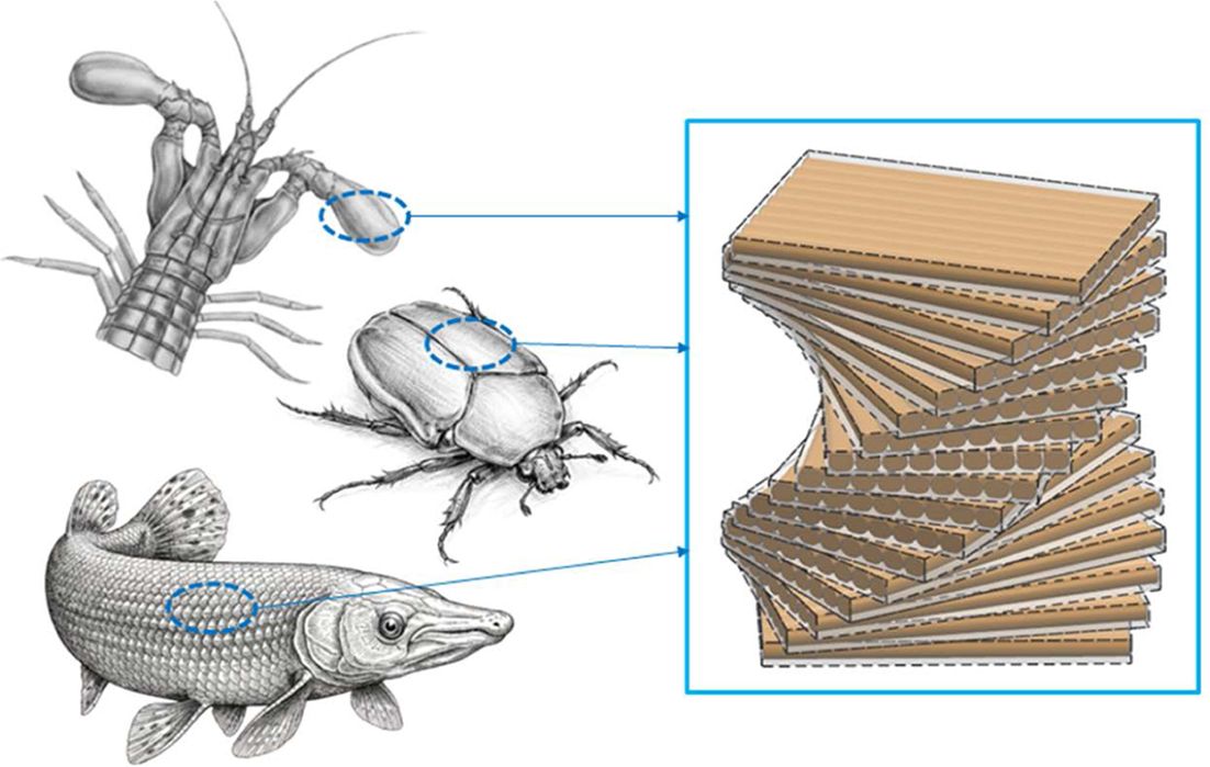 한편, 자연계에서는 외부 충격이나 반복적인 하중을 견디기 위해 고도로 진화된 구조들이 존재한다. Bouligand 구조는 물고기의 비늘, 딱정벌레의 외골격, 새우의 곤봉 등 생물학적 방어 구조에서 흔히 발견되며, 나선형으로 배열된 층들이 일정한 각도로 교차하며 적층된 구조이다.4,5 Figure 1에 Bouligand 구조에 대한 설명이 도식적으로 나타나 있다. 배열 방향이 층마다 회전하면서 배치되어 있어 하중이 작용하면, 균열이 단일 방향으로 직진하지 못하고 층간 배열 방향의 변화에 따라 균열이 편향(crack tilting)과 가교(crack bridging)되어 균열 전파를 억제하는 특성을 가진다. 결과적으로 Bouligand 구조는 외부의 충격에 대해 에너지 흡수율과 파괴 저항성을 향상시킨다.6-9 Bouligand 구조에 관한 연구는 주로 생체 유래 소재, 고분자 복합재 등의 재료를 중심으로 진행되어 왔다.10-14 그리고 자연계의 나선형 계층 구조를 모사하여 배열 방향과 층간 회전각을 제어한 실험 및 수치적 연구들이 있다. 이러한 연구는 Bouligand 구조가 다양한 하중 조건에서 파괴 저항성을 효과적으로 향상시킨다는 사실을 입증하였다. 또한 Bouligand 구조의 성능을 극대화할 수 있는 최적의 회전각을 규명하고자 하였다.15
