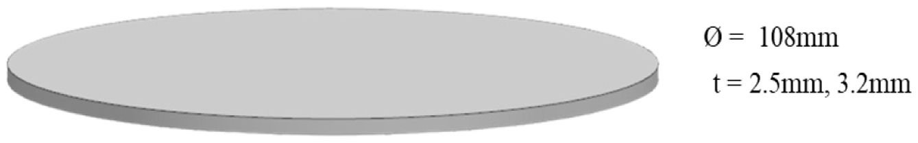 연구 모델. 3D 프린팅 및 동적 충격 시험을 위한 시편이 Figure 2에 나타나 있다. 시편 형상은 지름 108 mm의 원형 평판으로 두께는 2.5 mm 및 3.2 mm이다. 이 시편의 형상은 플라스틱의 동적 충격 거동을 측정하는 ISO 6603-2 규격에 해당된다.