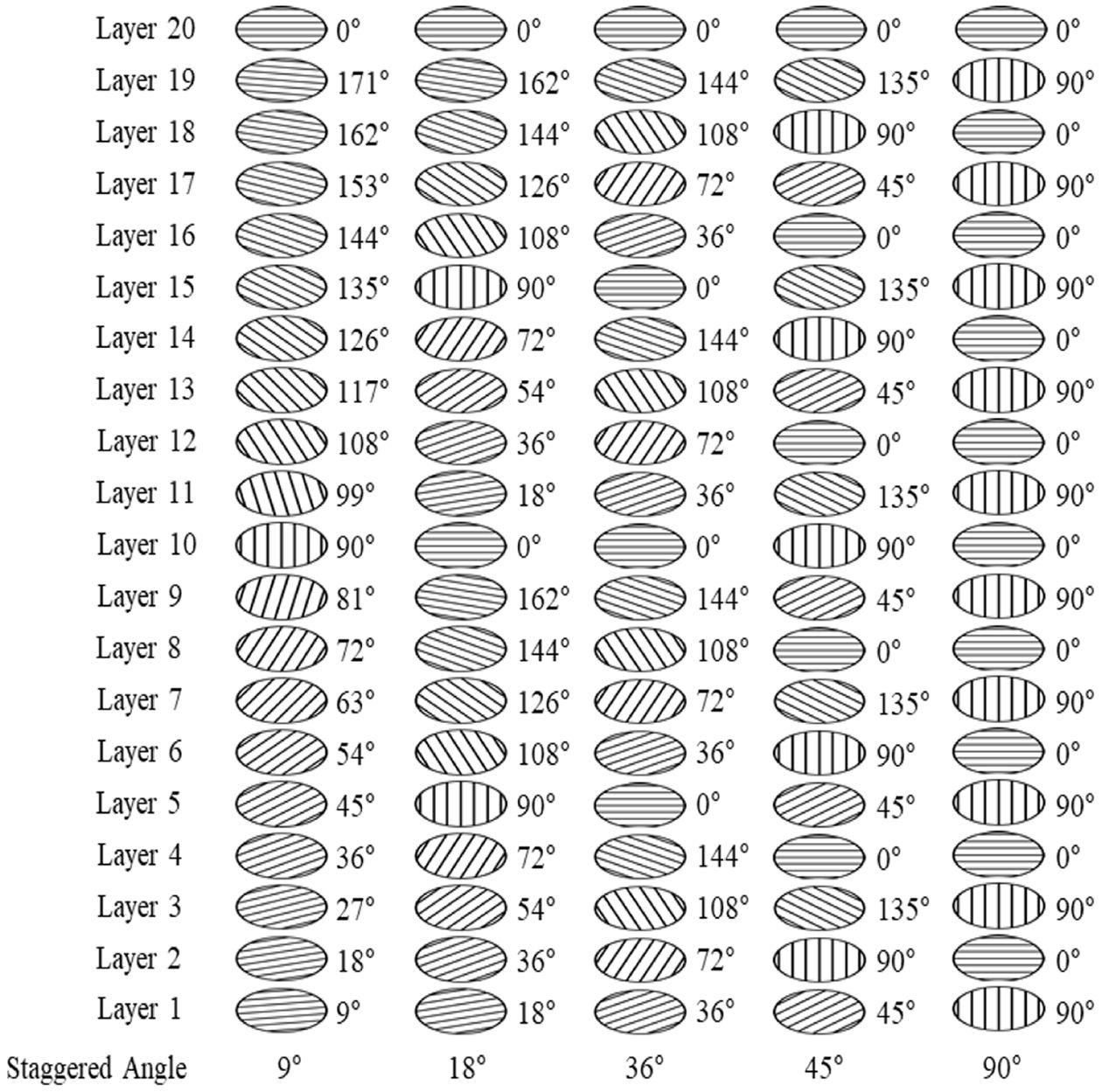 실험에 사용된 시편은 두께 2.5 mm 및 3.2 mm의 두 가지 이고 모두 20개 층으로 구성되었다. 이에 따라 두께 2.5 mm와 3.2 mm에서 한 층의 두께는 각각 0.125 mm, 0.16 mm이다. 모든 시편은 동일한 외형과 치수를 가지며, 적층 경로(tool path)만 다르게 적용하였다. 적층 변수는 비틀림 각도이며, 각 시편은 9°, 18°, 36°, 45°, 90°의 다섯 가지 비틀림 각도로 따라 적층 하였다. 적층 방식을 Figure 3에 도식화하였다. 모든 시편은 총 20개 층으로 구성되어 있는데 각층의 적층 경로가 똑 같지 않고 이전 층의 적층 경로에서 상대적으로 일정한 각도로 비틀어져 적층 되어 있다. Figure 3에 표시된 ‘staggered angle’은 각 층이 인접한 층과 이루는 적층 경로 차이 각도를 나타낸다. 두 층이 그 각도만큼 서로 비틀어져 있는 것이다. 그리고 ‘Layer 1’, ‘Layer 2’ 등에서 나타난 각도는 수평방향을 기준으로 각 층의 적층 경로, 누적 각도를 의미한다. 인접한 층간 비틀림 각도에 따른 점진적인 회전으로 Bouligand 구조의 원리를 구현한 것이다. 슬라이싱 소프트웨어인 Ultimaker Cura 5.7.1을 사용하여 적층 조건과 변수에 따라 적층 경로를 설계하였다. 이를 3D 프린터 작동을 위해 G-code로 변환하여 시편을 적층하였다. 각 적층 경로 즉 각 비틀림 각도에서 다섯 개씩 시편을 제작하여 충격 실험에 사용하였다.