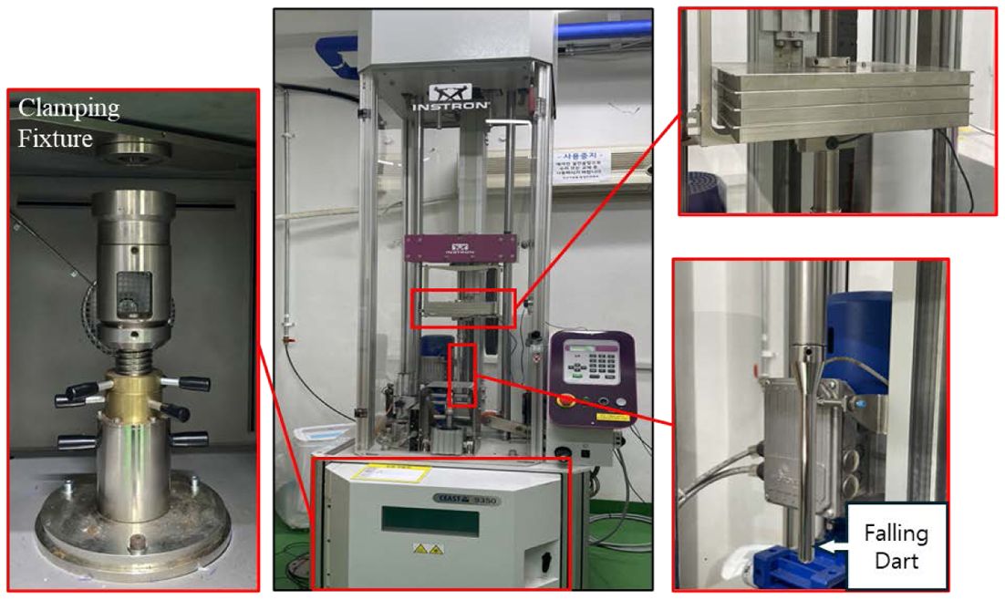 동적 충격 시험. 동적 충격 시험은 Instron(USA)사의 CEAST 9350 장비를 사용하였고, Figure 5에 나타나 있다. 시험은 ISO 6603-2 규격에 따라 시편 중심에 하중을 가하는 낙추 충격 방식으로 진행하였다. 질량 20 kg의 무게추에 직경 10 mm의 반구형 스트라이커가 장착된 장치를 이용하고 충돌 속도는 4.37 m/s로 설정하였다. Figure 5에 낙추의 형상이 나타나 있다. 시편은 내경 75.7 mm의 원형 개구부를 가진 고정부(clamping fixture)에 고정하였다. 비틀림 각도에 따라 다섯 개의 시편을 반복 시험으로 동적 충격 거동을 관찰하였다. 동적 충격 시험을 통해 시편이 낙추에 관통될 때의 최대 충격 하중과 충격 에너지를 측정하였다.