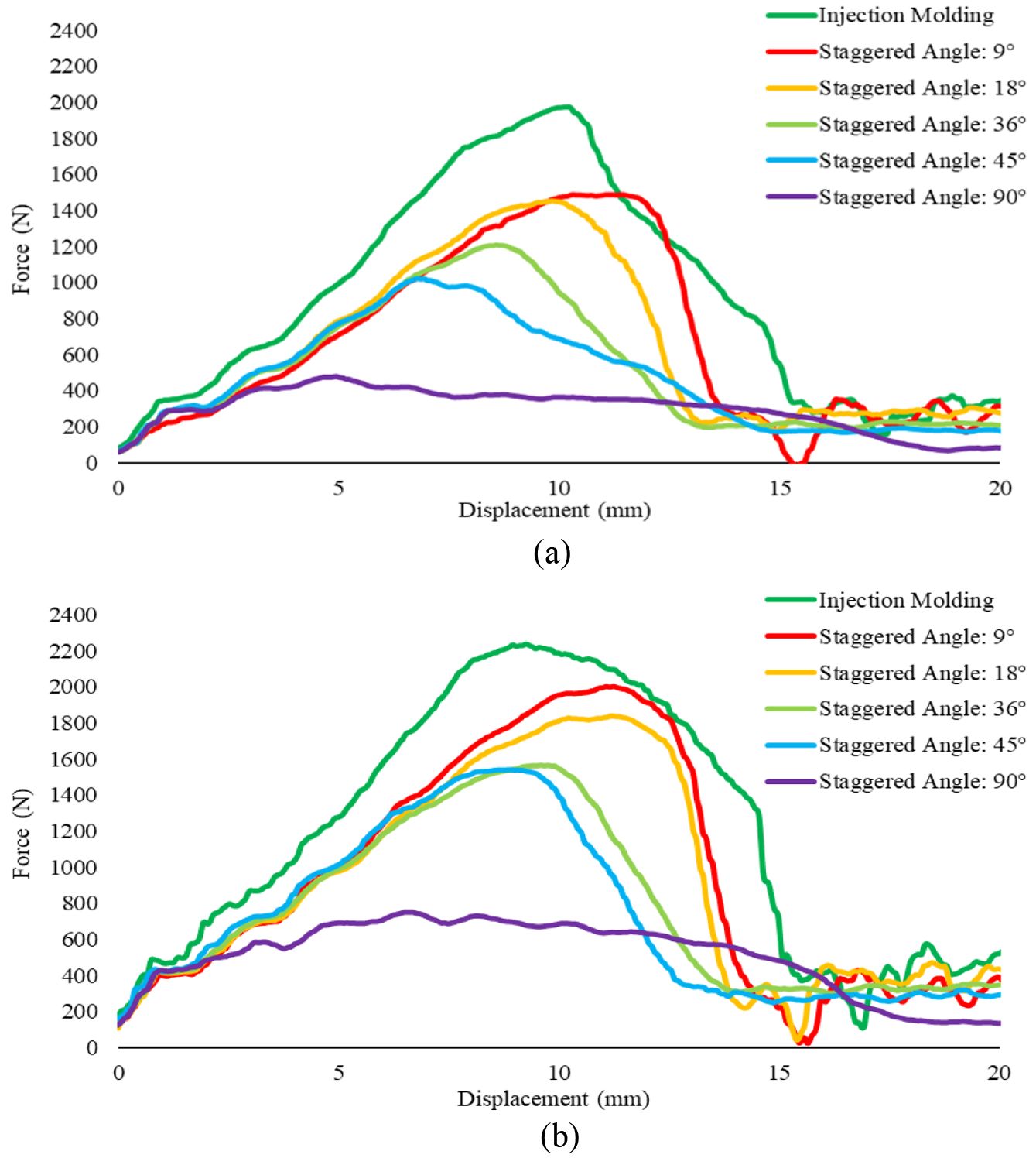 Figure 7 Peak force of specimen according to staggered angle: (a) thickness 2.5 mm; (b) thickness 3.2 mm |