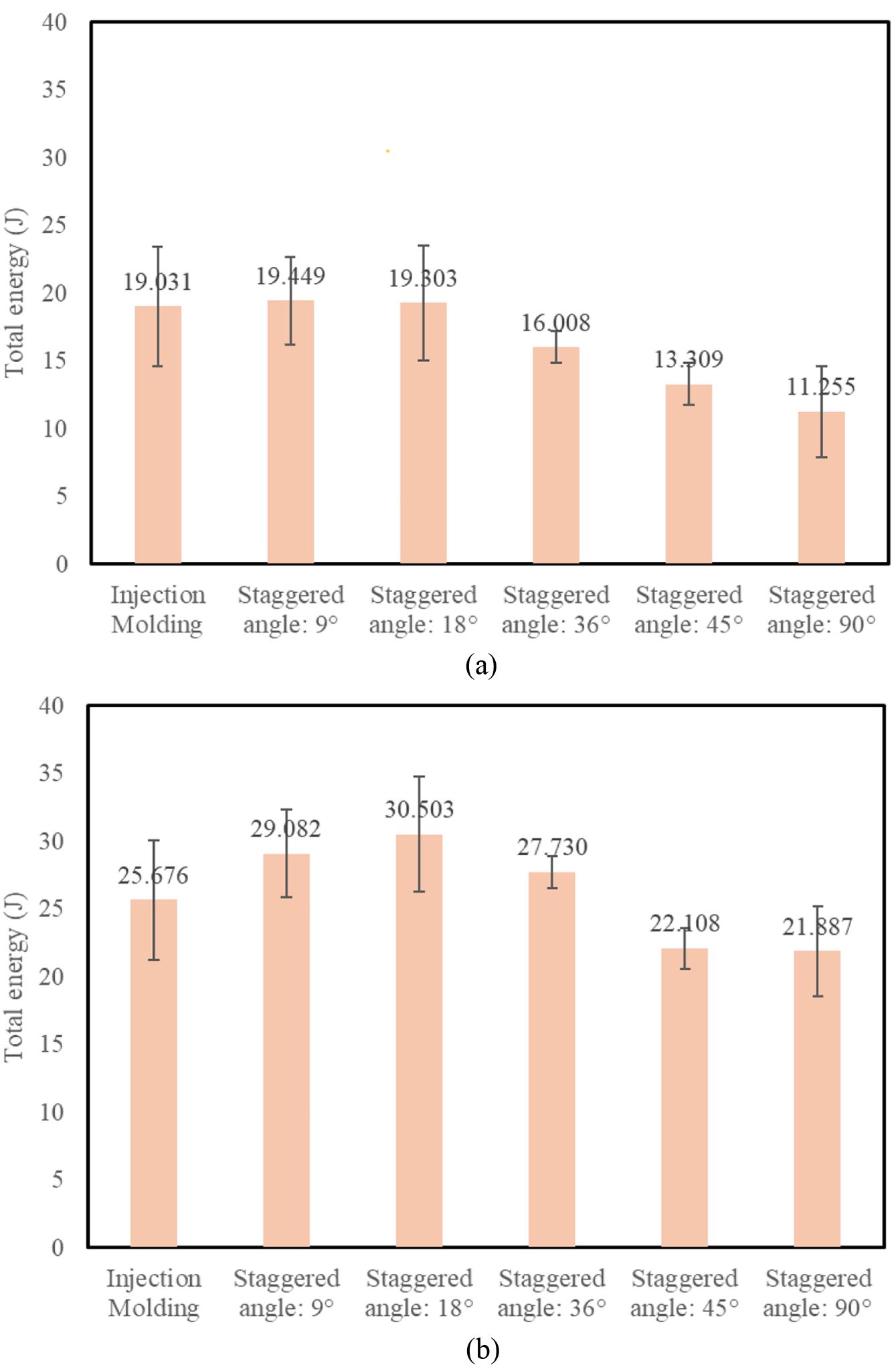 Figure 8 Total energy of specimen according to staggered angle: (a) thickness 2.5 mm; (b) thickness 3.2 mm. |
