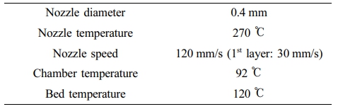 적층 시편 제작. 3D 프린팅을 통한 적층 시편 제작에는 Lincsolution(S. Korea)의 LINK EP-300 모델 3D 프린터를 사용하였다. 이 장비는 fused filament fabrication(FFF) 방식이며, 적층 체적(build volume)은 300×300×300 mm, 노즐의 최대 온도는 510 ℃, 챔버의 최대 온도는 250 ℃이다. 본 연구에서는 직경 0.4 mm의 노즐을 사용하였고, 노즐 온도는 270 ℃, 베드 온도는 120 ℃로 설정하였다. 안정적인 초기 적층을 위해 첫 번째 층의 적층 속도는 30 mm/s로 낮게 설정하였으며, 이후 적층부터는 제작 시간을 고려하여 속도를 120 mm/s로 증가시켰다. 적층 조건이 Table 1에 나타나 있다.